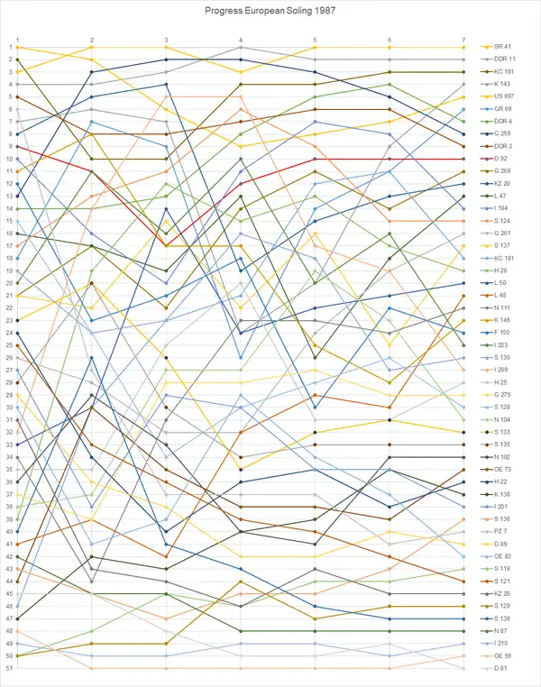 Remarkable is that the Norwegian team won this European Championship without a single race victory. The team of Jochen Schumann was in the lead until the final leg of the event. On the last moment team Terje Wang took the 8th place in the final race thus winning the event by just one point!