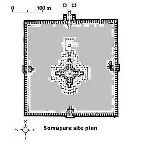 The site houses the architectural remains of a vast Buddhist monastery, Somapura Mahavihara, covering 11 hectares (27 acres). It was an important intellectual centre for Dharmic Traditions such as Buddhists, Jains and Hindus alike.[9] The 8.5-hectare (21-acre) complex has 177 cells, viharas, numerous stupas, temples and a number of other ancillary buildings.[10] The outside walls with ornamental terracotta plaques still display the influence of these three religions.