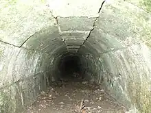 During excavations a drainage culvert was discovered about 20 m (22 yd) west of Terminus bridge.[31] Work resumed in September and November 2014 to batter and reshape the canal embankments. Excess topsoil was removed and the towpath reinstated on the stretch to the east from Terminus bridge for about 200 m (220 yd). On the same stretch a retaining wall was discovered in the south embankment continuing for about 100 m (110 yd), possibly built as a repair to a weak section of canal banking. Vertical infills of white clay have been used along this wall.
