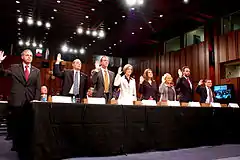 President Obama commissioned Sotomayor a justice of the Supreme Court on August 6, the same day as her confirmation.[71] Her swearing-in ceremony took place two days later, on August 8, at the Supreme Court Building. Chief Justice John Roberts administered the prescribed constitutional and judicial oaths of office, at which time she became the 111th justice (99th associate justice) of the Supreme Court.[72][73][74]