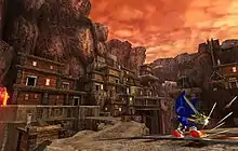 With the Wiimote, players are able to swing around the Caliburn sword to attack enemies, as well as defending themselves.[4][6][7] While travelling through the levels, the player interacts with various fairies which take the attribute of traditional Sonic items, such as springs and speed pads; yellow fairies give the player one to twenty rings, blue fairies increase the player's speed and jump height, and red fairies increases the "Soul Gauge", allowing the player to unleashed a homing Soul Surge attack when filled.[8][9] Beating stages with a higher rank gives the player better rewards,[6] which can be brought to the blacksmith (Tails) to create new, or upgrade old equipment.