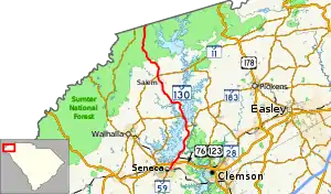 South Carolina Highway 130 (SC 130) is a 30.072-mile (48.396 km) state highway in Oconee County, South Carolina, connecting Clemson and eastern Oconee County with access to Lake Keowee, Lake Jocassee, and the Blue Ridge Mountains.