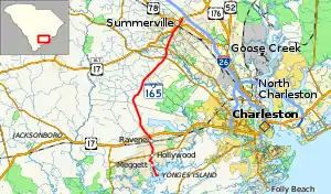 South Carolina Highway 165 (SC 165) is a 28.393-mile (45.694 km) state highway in the U.S. state of South Carolina. It connects Yonges Island to U.S. Route 17 (US 17) in Ravenel and US 17 Alternate in Summerville.