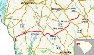 South Carolina Highway 184 (SC 184) is a 34.610-mile-long (55.699 km) state highway in the U.S. state of South Carolina. The highway connects the Georgia state line and the Ware Shoals area, via Antreville, Due West, and Donalds.