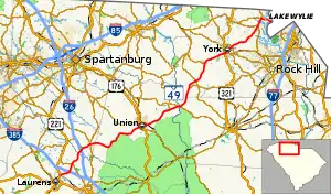 SC 49 is part of a three-state highway 49 (including North Carolina Highway 49 and Virginia State Route 49) that totals 325 miles (523 km) from Watts Mills, South Carolina to Crewe, Virginia.[6]