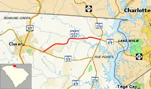 South Carolina Highway 557 (SC 557) is a 6.710-mile (10.799 km) primary state highway in the U.S. state of South Carolina. It serves as a connector route between Clover and Lake Wylie.