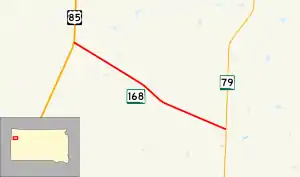 South Dakota Highway 168 (SD 168) is a state highway in Butte County in the U.S. state of South Dakota. It runs from U.S. Highway 85 (US 85) to SD 79. The highway is maintained by the South Dakota Department of Transportation (SDDOT), and is not part of the National Highway System.