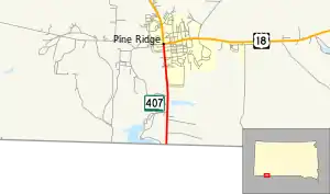 From its southern terminus SD 407 heads north along the eastern edge of, and then into, Pine Ridge. A few blocks after entering the main part of the community SD 407 reaches its northern terminus at an intersection with US 18 and BIA Route 32 (BIA Rd. 32). From the northern terminus of SD 407, US 18 heads easterly to Martin and Mission and northerly to Oglala and Hot Springs. BIA Rd. 32 heads westerly to terminate at BIA Route 41.[3][4] On average, SD 407 is driven by over 4,200 vehicles per day.[1]
