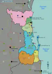 ![]() Regions of Queensland with South East Queensland in the bottom right hand corner of the state | |||||||||||||||