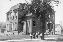 The first South School building was built in 1889, and it consisted of 2 classrooms.[2] A second storey was added in 1895, and it was considered to be a modern schoolhouse. A new building was planned on the South School property. This new building was also called South School and it was designed by Frank Moulton, of Flad & Moulton,[3] and partially funded by the Works Progress Administration. It served students from the east side of the Baraboo River, and grades kindergarten to 12. The original South School building was torn down, and replaced with tennis courts.[2]