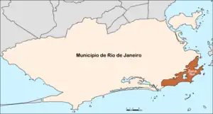 The South Zone (Portuguese: Zona Sul - Portuguese pronunciation: [ˈzonɐ ˈsuw]) is an area of the city of Rio de Janeiro situated between the Tijuca Massif, the Atlantic Ocean and Guanabara Bay. Most of it is made up of neighborhoods along the Atlantic coastline, such as São Conrado, Vidigal, Leblon, Ipanema, Copacabana, and Leme.
