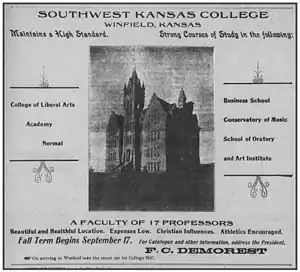 Southwestern College is a private Methodist college in Winfield, Kansas. It was founded in 1885 as Southwest Kansas Conference College and graduated its first class of three in June 1889. The name of the school was changed to its current form in 1909.