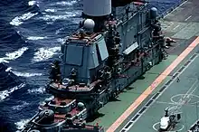 The fourth of the Project 1143 aircraft carrying cruisers, Baku had many differences from the rest of the class, trialing technologies to be used on the Admiral Kuznetsov. The most obvious is the massive passive electronically scanned array above the bridge. This was the phased array antenna for the Mars-Passat ("Sky Watch") 3D air search radar. Sky Watch proved troublesome and was probably never operational.[9]
