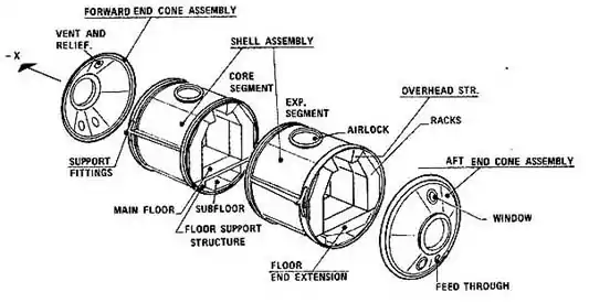 The habitable Spacelab laboratory module comprised a cylindrical environment in the rear of the Space Shuttle orbiter payload bay, connected to the orbiter crew compartment by a tunnel. The laboratory had an outer diameter of 4.12 m (13.5 ft), and each segment a length of 2.7 m (8 ft 10 in). The laboratory module consisted at minimum of a core segment, which could be used alone in a short module configuration. The long module configuration included an additional experiment segment.[10] It was also possible to operate Spacelab experiments from the orbiter's aft flight deck.[10]