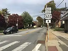 In the 1920s, the current routing of US 322 Bus. was designated PA 5 heading northwest of West Chester and US 122/PA 29 (later US 202) along High Street.[6][7][8] In the 1930s, US 322 was designated to run through the borough along Hannum Avenue, Gay Street, and High Street, replacing PA 5 and running concurrent with US 202.[9] US 322 was moved to a bypass of West Chester in the 1950s, and US 322 Bus. was assigned to the former alignment of the route through the borough.[10] US 202 was moved to the bypass by 1970, eliminating the concurrency it had with US 322 Bus.[11] The concurrent PA 100 designation along High Street between downtown and PA 52 was removed in 2003.[12]
