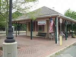 Speonk station was originally built in February 1870 along what was then the Sag Harbor Branch. From 1895 to 1897 it was known as "Remsenburg station", acknowledging the hamlet of Remsenburg, New York, which lies just south of Speonk. The station was struck by lightning and burned on June 22, 1901,[2] and a second depot opened in December 1901. Railroad conductors frequently accentuated the name when calling it out as the next station. This latter agency and depot were closed in 1958, and the station has been unmanned ever since. The former station was converted into a snack bar that is still operating as Little Gull cafe.[3]