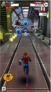 Spider-Man Unlimited is an endless runner game in which Spider-Man runs across New York rooftops, including that of the Oscorp building,[1] as well as Sinister Six spaceships and a giant Doctor Octopus machine,[2] as he dodges obstacles, defeats enemies, and collect power-ups and vials.[3] Regular enemies are defeated by slide attacks and punches,[2][4] while bosses requires the player to fling projectiles at them.[5] Players earn combos by overthrowing enemies;[4] almost hitting an obstacle or going through a ring also increases the player's combo count.[3][4][6] Sections in which Spider-Man swings through streets, climbs the sides of buildings and free-falls from buildings are interspersed with the running portions of the game.[3]