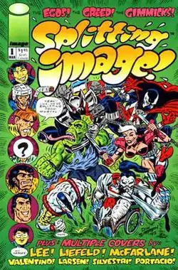 Splitting Image is a 2 issue comic-book limited series created in 1993 by Don Simpson (though based on an idea from Image co-founder Rob Liefeld[1]) and published by Image Comics. It satirizes the founders of Image and their initial titles such as Savage Dragon, Spawn, Youngblood, WildC.A.T.s: Covert Action Teams, Cyber Force, Shadowhawk, Wetworks, and Pitt. Issue #2 ends with a cliffhanger ending featuring Megaton Man, Captain Everything from normalman, and Mr. Spook from Tales of the Beanworld which was continued in the Megaton Man/normalman Special. In 2017, to celebrate the publisher's 25th anniversary, Image released an 80-Giant Special collecting both issues of Splitting Image along with the Normalman/Megaton Man special and supplementary material.[2]
