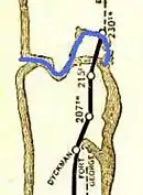 With the completion of the Erie Canal in 1825,[22] and the advent of large steamships in the second half of the 19th century, a broad shipping canal was proposed between the Harlem and Hudson Rivers to allow them thru-transit by bypassing the tight turn up and around Marble Hill. The Harlem Canal Company (then stylized as the "Harlaem Canal Company") was founded in 1826, but did not make any progress towards building a canal.[21][27][24] A second company also failed to complete the project.[21] In 1863 the Hudson and Harlem River Canal Company was created, and began the final plans for the canal.[21][24] The U.S. Congress broke the logjam in 1873 by appropriating money for a survey of the relevant area, following which New York state bought the necessary land and gave it to the federal government.[28][24][29] In 1876, the New York State Legislature issued a decree for the construction of the canal.[3] Construction of the Harlem River Ship Canal officially the United States Ship Canal[30] finally started in January 1888.[28][29] The canal would be 400 feet (120 m) in width and have a depth of 15 feet (4.6 m) to 18 feet (5.5 m). It would be cut directly through the rock of Dyckman's Meadow, making a straight course to the Hudson River.[21][28] The first section of the canal, the cut at Marble Hill, was completed in 1895 and opened on June 17 of that year.[3][31][32] Several festivities including parades were held to commemorate the occasion.[32][33] At this time, Tibbets Brook was diverted into storm drains underneath Broadway, with the old right-of-way becoming Tibbett Avenue.[17][34]