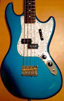 Talking to Total Guitar, Jarman explained that the bass was an amalgamation of his favorite Fender models. Prior to the release of his signature instrument, Jarman had usually been seen using Fender Mustang Basses and Precision Basses.[1] He claims the concept of his signature instrument was influenced by both these basses, as well as an obscure Fender design from the 1960s, the Bass V.[2] The bass features a split coil humbucking pickup, hi-mass bridge, and an unusual 32" scale length neck- a compromise between the short scale Mustang Bass (30"), and the Precision (34") “I use a P-Bass, but before that I always used Mustangs and I wanted to find a balance between the two [scale-lengths], so we made a medium-scale neck.”[2] he explained. The bass also features a headstock shape which dates back to the original Precision Bass design from the early 1950s.