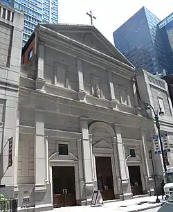 The church has suffered two fires. The first, which badly damaged it but left the towers standing, occurred on December 24, 1898. The following February, plans were filed to rebuild it and add a semi-octagonal chancel to the rear, at the expected total cost of $40,000 ($1,400,000 in current dollars).[11] The second fire, on December 10, 1992, left only the outside walls and the towers standing,[12] costing $2 million for demolition ($4.2 million current) and $6 million for the new building ($12.5 million current).[9] The church was rebuilt to designs by the firm Acheson, Thornton, Doyle, and opened in 1998. The new church was modeled after the Church of the Gesù in Rome, but with the original towers from O'Connor's church flanking the new building.[1][2][13]