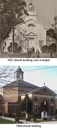 The Mission of St. Clare met in a rented hall until 1921, when its own church building was dedicated on the hilltop of Nelson Avenue. This wooden building accommodated 250 people, and was commended as the first Catholic church in the United States designed in simple Colonial style, by young architects Otto R. Eggers and Daniel P. Higgins. (Higgins was a member of St. Clare's congregation.) To make way for a larger church, in 1957 the building was rolled to a new site on Nelson Avenue, where it remains in use as a chapel for weekday Masses and Eucharistic Adoration. When a deteriorated foundation required major reconstruction in 2003, the parish added a finished basement, for a large and flexible meeting space (including a lending library) named the Faith Formation Center.[25][27]