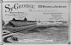 The stadium, which was built in the style of a typical horse race track grandstand, was first used as a baseball field in 1853, with the first game between the New York Knickerbockers and the Washington Club.[2] The site later became part of the development of the then-new community of St. George, Staten Island in 1886, by Erastus Wiman. He established the Staten Island Amusement Company, which owned both the Metropolitans and the grounds. Fans were able to watch games while also watching the construction of the Statue of Liberty a few miles to the north.