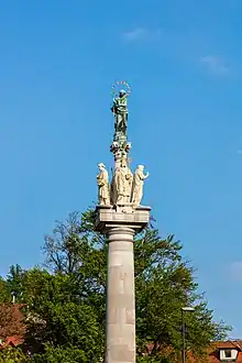 The originally marble column, dedicated to the Virgin Mary, was designed by Johann Weikhard von Valvasor, featuring the brass statue of the Virgin cast by the town bell-maker Christoph Schlag upon the model of the Salzburg-based artist Wolf Weisskirchner, and the stone statues of Saint Joseph, Saint Leopold, Saint Ignatius of Loyola, and Saint Francis Xavier.[1] The used thin-wall brass sculpture casting technique, invented by Valvasor, was published in the Philosophical Transactions of the Royal Society (London, 1687), and is considered the first internationally recognised Carniolan invention.[2]