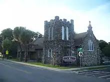 The historic church building was erected in 1922 and dedicated in February, 1923. The Reverend William C. Richardson, MD, a retired physician-turned-priest, personally spearheaded the construction of the church, even purchasing and donating the land. He selected architect Louis A. Fort to design the Gothic Revival church, including a tower, battlements, and stained glass windows.[7] The church building is unique in its construction, with 16-inch-thick (410 mm) concrete walls on the interior, and exterior walls composed entirely of flint rock, stacked with mortar. The rocks were collected from the bottom of the Hillsborough River where it empties into the bay, however, the rocks did not occur there naturally. The rocks came from all around the world aboard the sailing ships of centuries past, and wound up in Tampa as the ships discarded ballast from their hulls.[6] Because of the striking stonework exterior, the building is occasionally referred to as "The Rock Church."