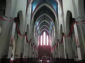 Windows are fitted with tall stained glass and have pointed arches.[5] The cathedral's stained glass windows were produced in France before being transported to Vietnam.[18] The ceiling is rib-vaulted like those seen in medieval Europe. The nave is weathered, while the sanctuary is made of polished gilt-trimmed wood, similar to that of Phát Diệm Cathedral, and has architectural embellishments in the imperial Huế style. A statue of the Virgin Mary is kept in a palanquin according to local custom, which is seen to the left of the nave. A pipe organ designed by the Belgian craftsman Guido Schumacher was installed in the cathedral on 23 November 2022 as part of a cultural exchange project between Itami in Japan and Hasselt in Belgium; the instrument has 1,850 pipes.[23]