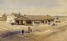 The original market was known as Market Square and people gathered there on Saturdays at the corner of King Street and New Street, (today's Jarvis St) stretching west to Church Street and south to Palace (today's Front St), with a creek running through the center from King south to the bay.[4] The plot set aside for the market was 5.5 acres (2.2 ha).[5] The market square was the centre of the city's social life where auctions took place and public punishments were carried out.[3] In the earliest days of the town, when slavery was still legal, this included auctions of black slaves.[6] Town bylaws prohibited the selling of butter, eggs, fish, meat, poultry, and vegetables between the hours of 6am and 4pm on Saturdays, except at the market.[6]