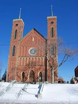 It was built in 1870–75 in a French Gothic/High Victorian Gothic style. It is rectangular, 60 by 130 feet (18 m × 40 m) in plan, with two square 100 feet (30 m) tall towers. It served a community of French Catholic immigrants who left eastern France in 1826 and settled here. A brick church was built by 1838, which was demolished in 1869 to make room for the present church which was completed in 1875. It was designed by parish priest Father Louis Hoffer reportedly after the design of a small village cathedral in France. Its interior was designed by Cleveland architect Frank Walsh.[2]
