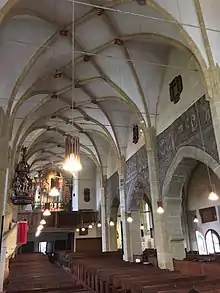 The main altar, located in the choir of St. Margaret's church, is a late Gothic winged altarpiece, dated between 1480 and 1520. Its work-day (closed) view is adorned with eight painted panels depicting the passion of Christ.[7] On the northern walls of the nave and north aisle, frescoes were discovered under layers of white paint, and partly restored.[8] In the choir, eight grave slates are on display today, one of them commemorating the pastor, poet and humanist Christian Schesaeus (1535–1585). Various wooden and painted epitaphs adorn the interior of the church. St. Margaret's church also harbours one of the largest collections of the so-called "Transylvanian" rugs, 16th–18th century Anatolian rugs in Europe.[9]