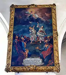 The pulpit in the nave of the basilica was designed by Johann Friedrich Sichelbein and manufactured according to his plans from 1699 to 1700.[12] It represents a joint work of two artists. The carpentry work was done by Georg Rabus, the sculptural elements by Christoph Heinrich Dittmar from Arnstadt. The pulpit was made mainly of walnut with a few golden decorations. The sounding board has the shape of an onion dome and is crowned by an angel playing a trombone. On the outside it is decorated with acanthus leaves. Five statues of Jesus and the four evangelists are set into the pulpit basket in recesses provided for them. At the bottom of the basket, angel heads are grouped around a golden cluster of grapes. The pulpit doorway is decorated with fielding and fruit hangings. Above the door is a figure of John the Baptist. Overall, it is a high work of art of the Upper Swabian Baroque.