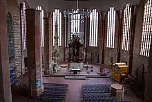 The original pulpit altar which had been destroyed in 1945 was replaced by an early eighteenth-century altar (on permanent loan from a church in Jüterbog). The cathedral's Gothic vaulting was only partially reconstructed and supplemented by a plain wooden ceiling.