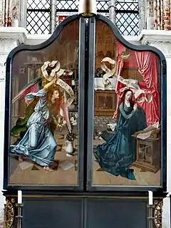 - The fully closed position (nowadays, this is the position in the Christian Holy Week before Easter Sunday), shows the Annunciation by the Master of 1518.
