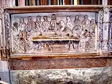 - In the ambulatory, sandstone reliefs (1515) from the atelier of Heinrich Brabender, with scenes from the Passion of Christ: to the north, the Washing of the Feet and the Last Supper; to the south, Christ in the garden of Gethsemane and his capture. The Last Supper relief includes a detail associated with Lübeck: a little mouse gnawing at the base of a rose bush. Touching it is supposed to mean that the person will never again return to Lübeck – or will have good luck, depending on the version of the superstition.
