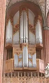 - ↑ German: mit größter Wahrscheinlichkeit die erste und einzige gotische Orgelfassade mit einem Zweiunddreißigfuß-Prinzipal (tiefste Pfeife rund 11 Meter lang) in der damaligen abendländischen Welt