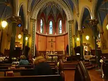 From February 2019 to October 2020, the St. Mary church building was temporarily closed for emergency repairs; century-old plaster had come loose and fallen from the ceiling.[6] In addition to the plaster repairs, the John Canning Company performed extensive research into the historic decorative schemes of the church, to inform its new repainting and decoration of the interior. Their efforts included forensic removal of the outer layers of interior paint to uncover original 1800s and early 1900s stenciling details and paint colors. According to the National Catholic Register, "St. Mary's early decorations inspired all the stencil patterns for the arches, aisle walls and wainscot since the Canning crew was able to find and use those patterns exactly or modify them to work with the overall idea". Further review of archival photographs and newspaper accounts revealed circular tondo portraits of saints in each arched bay along the naive, as well as portraits of three angels above the main altar; the Canning Company recreated these tondos, working with the parish to choose a new series of modern and historic saints to be depicted. The three archangels were also depicted above the altar, reflective of increased devotion to Saint Michael according to pastor.[7]