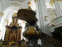 The pulpit is in the center of the building which was crafted out of marble by sculptor Otto Lessing from Dresden in 1910. It was designed to look like a rounded chalice and features a magnificent staircase. The large pulpit roof is crowned by the Angel of Annunciation.