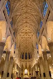 Monsignor Michael J. Lavelle started raising $625,000 from the congregation in 1926 to renovate the cathedral.[136] The next year, Robert J. Reiley was hired to conduct renovations, including replacing the wooden floor with a marble floor.[137] The floor was replaced between April and December 1927. The old organ was also replaced and new stained-glass windows, altar, and pews were being installed in the Lady chapel. The sanctuary was extended approximately 8 feet (2.4 m), the metal communion rail was replaced with a bronze and marble rail, and the wooden throne was replaced with one of marble.[138] Amplifiers,[139][140] wrought-iron doors,[141] and new bronze chandeliers were installed.[142] New pews were also installed,[143] as were two new organs.[144] English stained glass artist and designer Paul Vincent Woodroffe completed the Lady chapel's remaining windows by late 1930.[131][145] With the construction of Rockefeller Center to the west, several trees were planted around the cathedral in 1939 to complement Rockefeller Center's trees.[146]