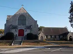 Its historic parish church is located at 424 East Main Street. Designed by noted Arkansas architect Charles L. Thompson, it was built in 1916 to replace the original 1869 structure. Its main block is a cruciform stone structure with Gothic Revival styling, and a squat square tower located at the inside corner of the nave and eastern transept. The main entrance is set at the northern end of the nave, in a segmented-arch opening set in a low projecting section. The gable end above the entrance has a large Gothic-arched stained glass window.[3] The building was listed on the National Register of Historic Places in 1982.[1]