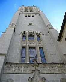 The church grew along with the city of Houston, and in the late 1920s, members launched a campaign to raise money for new and larger facilities. Jesse H. Jones, Walter Fondren Sr., and James Marion West Sr. each contributed $150,000, and the church hired noted architect Alfred C. Finn to design a new building at the corner of Main and Binz streets. The Neo-Gothic styling features a cruciform plan on a steel-frame structure with limestone cladding. Stained glass windows are from the original structure, and the tower houses bells also brought from the church’s original sanctuary. It has been described as "one of Houston's grandest houses of worship."[2]