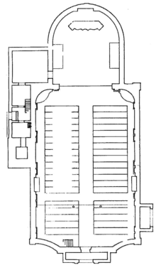 In the interior, on the south side, there are two matronea, the upper of which is used as an organ loft. The first gallery is built in at a height of three meters, the second is located 2.7 meters above the first and is set back on the left and right, strongly curved forward in the middle. Under the gallery is the portal of the church, whose wings are decorated with curved filling frames.