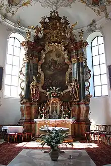 It is assumed that he based the interior design on the Buxheim parish church, which was decorated by the Zimmermann brothers. The three altars (high altar, Lady altar and Joseph altar) and the pulpit were created under the influence of Gabriel Weiß the Elder from Bad Wurzach and his son of the same name. The sculptors and carvers probably belonged to the circle of Anton Sturm from Füssen[11] and Dominikus Hermengild Herberger, a native of Upper Swabia.[12] The name of the fresco painter has not been handed down. The church was renovated for the first time in the 19th century. In 1922 the room shell and the frescoes were repaired. The large ceiling fresco, which was painted over during the first renovation, was renewed by Josef Albrecht. At about the same time, the door leading from the nave to the tower was bricked up and the entrance from the sacristy to the lower part of the tower was created. In 1949 the altars, the pulpit and the figures received new settings. The last comprehensive restoration took place from 1989 to 1997. During this time, the entire church was renovated and the choir was equipped with a new popular altar by Jörg Maxzin. In 2009, the retaining wall with the staircase, east of the church, had to be renovated at a cost of 135,000 euros, as its stability was no longer guaranteed.