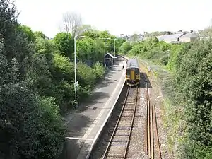 There is a single platform, on the left of trains arriving from Plymouth. The only facilities are a small waiting shelter, and timetable posters at the top of the path leading down to the station. There are no ticket buying facilities, so passengers have to buy a ticket in advance or from the guard on the train.