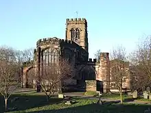 In the churchyard is a red sandstone sundial with a copper dial which is listed Grade II.[26] It was erected in 1800 by the stonemason John Moors at a cost of £10.3s.3d.[27] The churchyard also contains the war graves of seven soldiers of World War I, and a Royal Navy sailor of World War II.[28] An upper portion of a floriate medieval gravestone removed during 19th-century renovations lies near the south porch.