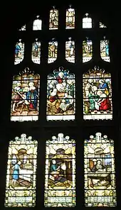 Pevsner describes the reredos and altar designed by Austin and Paley as "extremely handsome" and "gorgeously painted" in gold, red and green by Shrigley and Hunt.[10] Stained glass windows installed between 1887 and 1933 in the Lady chapel, south aisle and several in north aisle are also by Shrigley and Hunt while others including the west window are by Charles Eamer Kempe.[2] The Speakman window is of interest as it depicts scenes from the industries on which Leigh was built, panels include weavers, engineers and colliers.[15]