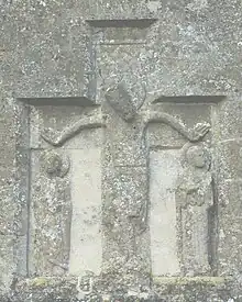 The porch includes two Anglo-Saxon stone rood reliefs, but they are repositioned and their original sites are not known. The one on the east wall of the porch is 8th century[7] and has lost its head.[8] The one on the south gable of the porch is 10th century[9] and has been assembled with Christ's left and right arms swapped over and the figures of Saint Mary and Saint John the Evangelist also transposed.[6]