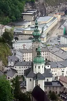 The present-day Romanesque abbey church at the northern foot of the Mönchsberg was erected from about 1130 onwards at the site of a previous Carolingian church building, it was dedicated to Saint Peter in 1147. One of the organs was located atop the rood screen in 1444, a work by Heinrich Traxdorf of Mainz. While the steeple received its onion dome in 1756, the interior was often re-modelled before attaining its currently visible Rococo style between 1760 and 1782 under Abbot Beda Seeauer's direction.[3] The high altar is a work by Martin Johann Schmidt. The St. Mary's Chapel contains the grave of Abbot Johann von Staupitz (d. 1524), who was Martin Luther's superior; they were both Augustinian monks in Germany at the time.